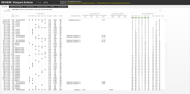 Following are screenshots of the “REVIEW: Vineyard Actions” – Layout. The first lists all the individual activities of 2018, the substances added, and the manhours spent on each (note the list is longer than the screenshot reveals). The second provides an overview of the “substances added,” the Sprays and Soil Amendments. The third shows the cumulation of manhours by vineyard block and type of activity, and the last screenshot summarizes the weather conditions.